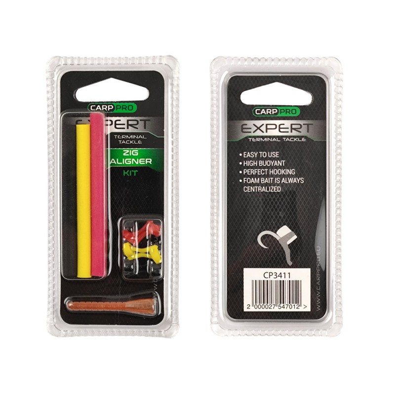 Набор для зиг-рига Carp Pro включает в себя приспособление для насаживания пенки (адаптер), три палочки пенки красного, желтого и черного цвета и три пары лентяек таких же цветов. Лентяйки оснащены петлями для пенки. Форма этой лентяйки со вставленной пенкой имитирует форму личинки насекомого с тонким изогнутым телом и большой головкой.