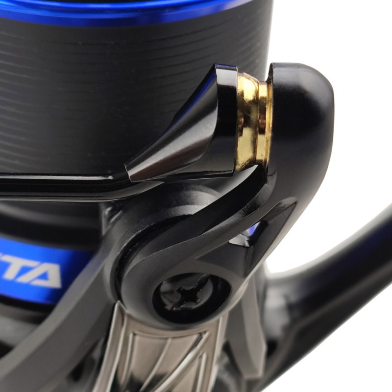Корпус и ротор из высокопрочного пластика снизили вес катушки, сохранив её рабочие характеристики. Передний фрикцион обладает быстрой регулировкой усилия до 12 кг, что идеально подходит для ловли сильной и активной рыбы. Прочная алюминиевая ручка с увеличенным Т-образным кнобом вкручивается в главную пару, исключая люфты и обеспечивая комфортное использование.