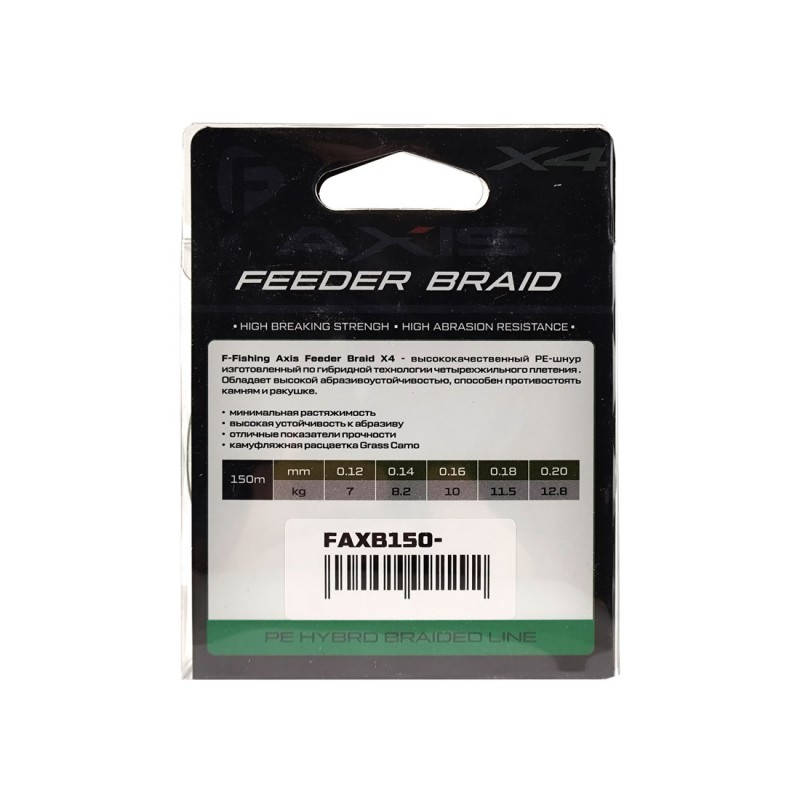 F-FISHING AXIS FEEDER BRAID X4 — это высококачественный плетеный шнур, созданный по гибридной технологии с использованием четырех нитей. Он отличается высокой устойчивостью к абразиву и способен эффективно справляться с воздействием камней и ракушек. Благодаря технологии Hybrid, обеспечивающей плотное плетение волокон, шнур F-FISHING Axis Braid PE X4 обладает минимальной памятью и практически нулевой растяжимостью, что значительно повышает чувствительность снасти. Плотная структура шнура предотвращает попадание абразивных частиц, взвешенных в воде, между волокнами и не вызывает износа колец удилища. Этот шнур отличается долговечностью, прочностью, отличными характеристиками при завязывании узлов и хорошими кастинговыми качествами, при этом оставаясь доступным по цене для всех рыболовов. Он специально разработан для фидерной ловли и имеет эффект камуфляжа: базовый зеленый цвет дополнен темными вставками, что делает его незаметным на любом грунте и в воде, сливаясь с окружающей средой и не привлекая внимания рыбы. Доступен в размотке 150 метров.