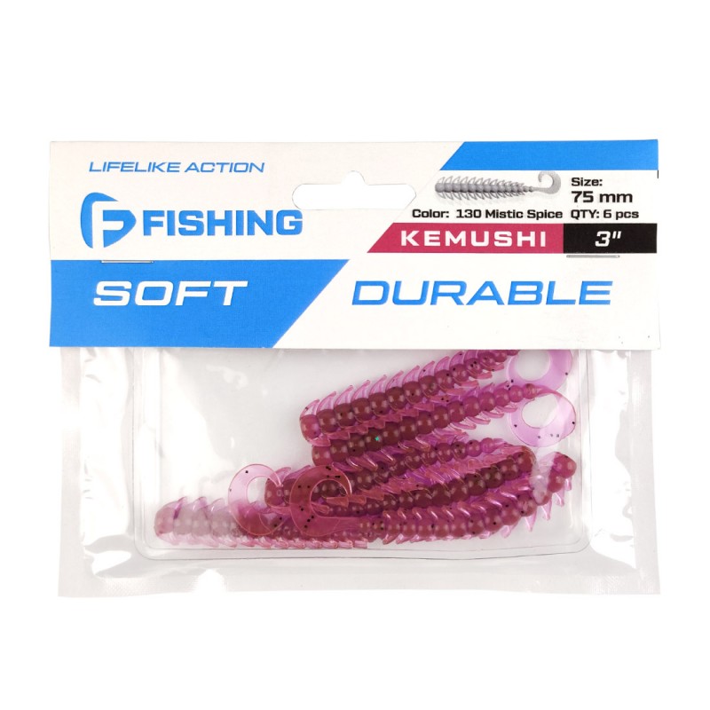 Твистеры F-Fishing Kemushi – популярная и проверенная годами «съедобная» приманка. Она показывает исключительную эффективность при ловле окуня, щуки, судака. Фирменный материал, из которого изготовлена приманка, отличается сильной аттрактацией, эластичностью и в то же время долговечностью. Секрет твистеров Kemushi – в комбинации игры и запаха. Активную игру хвостика и турбулентность, создаваемую оригинальным сегментированным телом и ножками-плавниками, хищник чувствует с большого расстояния. Приманка «съедобная», имеет двойную внешнюю аттрактацию, что обеспечивает ей устойчивый привлекательный для хищника запах. Благодаря наличию соли в составе материала хищник удерживает такую приманку в пасти дольше, чем обычную, и поклевки чаще заканчиваются результативной подсечкой.