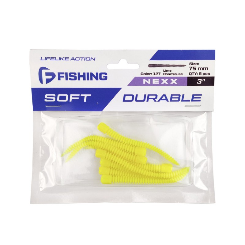 Характерным элементом этого слага является тонкое тело, сужающаяся хвостовая часть, увенчанная миниатюрным, подвижным хвостиком. В результате силиконовая приманка F-Fishing Nexx весьма похожа на пиявку, червя или личинку, на которые так охотно клюет хищная рыба.