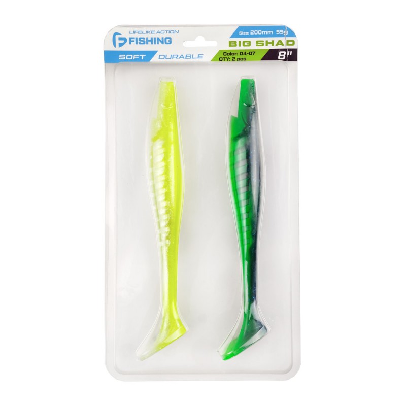 F-FISHING Big Shad 8" – крупный виброхвост удлиненной формы, изготовленный из мягкого силикона. Тело приманки сплющено с боков, сверху и снизу имеются специальные прорези, оптимизирующие использование Big Shad с офсетным крючком. Благодаря объемной пятке виброхвост начинает играть даже при самой медленной проводке. Игра его легкая и размашистая. Колебания хвоста передаются на тело, благодаря чему приманка раскачивается при проводке, привлекая хищника с больших расстояний. На теле Big Shad имеются специальные насечки, которые создают привлекательную для хищника турбулентность. Приманка отлично работает на классической джиг-головке, шарнирном монтаже, штопоре. Модель прекрасно подойдет для ловли трофейного судака, щуки и сома. Большой рыбе – крупная приманка, – это как раз о Big Shad!