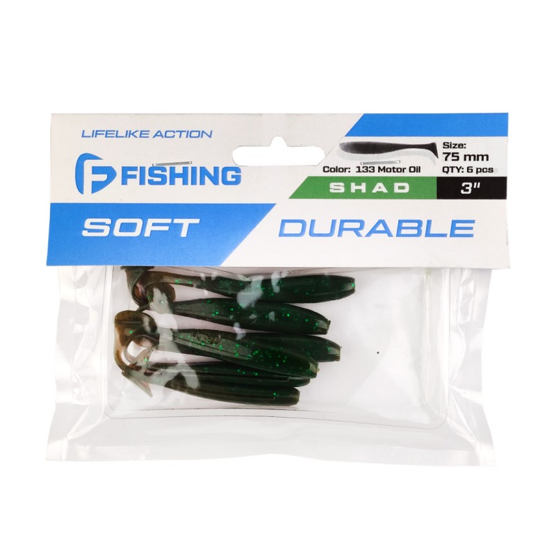 F-Fishing Shad 3" – классический виброхвост удлиненной формы, изготовленный из мягкого «съедобного» пластика. Тело приманки сплющено с боков, сверху и снизу имеются специальные углубления, оптимизирующие использование Shad с офсетным крючком. Благодаря довольно большому хвостовому пятаку и тонкому сильно сплющенному хвостовому стеблю, виброхвост начинает играть даже при самой медленной проводке. Игра его легкая и размашистая. Колебания хвоста передаются на тело, которое извивается и раскачивается при проводке. Чтобы использовать в полной мере эти свойства приманки, лучше применять легкие крючки с относительно коротким цевьем. Небольшой офсетник на шарнирном монтаже будет отличным вариантом, тем более, данный виброхвост к его использованию очень хорошо приспособлен. Приманка Shad сильно аттрактирована, в составе материала содержится соль. Прекрасно подойдет для ловли крупного окуня, судака, щуки и сома.