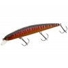F-Fishing Hellcat 130F – крупный, сильно вытянутый воблер, который прекрасно работает при поиске щуки на больших акваториях. Имеет длину 130 мм и весит 19 г. Система дальнего заброса обеспечивает очень сильное смещение центра тяжести в хвостовую часть, благодаря чему воблер летит как дротик – далеко, точно и с минимальными колебаниями. В передней части корпуса шарики фиксируются приливом на дне канала, по которому они передвигаются. Благодаря этому воблер при проводке имеет фиксированный центр тяжести. Уходы в стороны во время рывковой проводки Hellcat 130 совершает очень дальние, как и положено воблеру такой большой длины с вытянутыми пропорциями. Характерной особенностью движений воблера является покачивание с боку на бок во время этих уходов. Оно не затухает даже после полной остановки приманки и является дополнительным привлекающим фактором, провоцирующим хищника на атаку во время паузы. При равномерной проводке Hellcat 130 F обладает не слишком интенсивной высокочастотной игрой, поэтому лучше не использовать эту приманку для равномерной проводки в стоячих водоемах. Впрочем, при проводке потяжками, как ведут крэнкбейты, воблер демонстрирует хорошие результаты. Оснащен тремя острейшими крючками VMC и усиленными заводными кольцами.