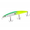 F-Fishing Hellcat 130F – крупный, сильно вытянутый воблер, который прекрасно работает при поиске щуки на больших акваториях. Имеет длину 130 мм и весит 19 г. Система дальнего заброса обеспечивает очень сильное смещение центра тяжести в хвостовую часть, благодаря чему воблер летит как дротик – далеко, точно и с минимальными колебаниями. В передней части корпуса шарики фиксируются приливом на дне канала, по которому они передвигаются. Благодаря этому воблер при проводке имеет фиксированный центр тяжести. Уходы в стороны во время рывковой проводки Hellcat 130 совершает очень дальние, как и положено воблеру такой большой длины с вытянутыми пропорциями. Характерной особенностью движений воблера является покачивание с боку на бок во время этих уходов. Оно не затухает даже после полной остановки приманки и является дополнительным привлекающим фактором, провоцирующим хищника на атаку во время паузы. При равномерной проводке Hellcat 130 F обладает не слишком интенсивной высокочастотной игрой, поэтому лучше не использовать эту приманку для равномерной проводки в стоячих водоемах. Впрочем, при проводке потяжками, как ведут крэнкбейты, воблер демонстрирует хорошие результаты. Оснащен тремя острейшими крючками VMC и усиленными заводными кольцами.