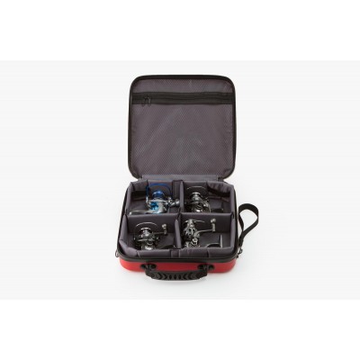 Кейс предназначен для перевозки и хранения четырех спиннинговых катушек размером 5000-6000. Есть возможность трансформации внутреннего пространства, в том числе в единый большой блок. Материал корпуса - ударопрочный пластик, внутренняя прокладка - текстиль и износостойкий поролон. Соединение двух половин корпуса происходит водостойкой прорезиненной молнией. Кейс надежно оберегает катушки от механических воздействий, не промокает, легко очищается от любой грязи.