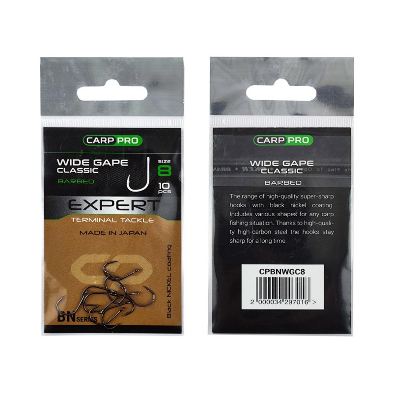 Carp Pro Black Nickel Wide Gape Classics — серия карповых крючков классической формы, с широким зевом для всех видов и типов насадок. Используется как с термоусадками и лентяйками, так и без них. Материал крючка — особо прочная, высокоуглеродистая сталь. Благодаря японской технологии химической обработки жала, крючок всегда очень острый. Кончик жала слегка изогнут, что обеспечивает отличную засечку.