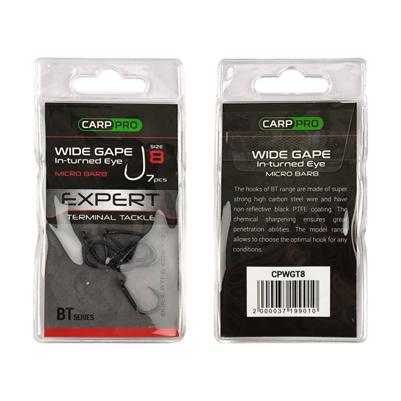 Серия карповых крючков из тонкой, высокоуглеродистой проволоки с темным, защитным P.T.F.E. покрытием. Такое покрытие исключает блики в воде и не пугает даже самую осторожную рыбу. Серия Carp Pro BT включает в себе крючки классической и проверенной формы для ловли карпа и амура. Химическая заточка жала позволяет крючку легко и быстро проникать в губу рыбы. Все крючки этой серии имеют плоскую кованую форму в области зева, что добавляет крючку ребро жесткости для дополнительной прочности.