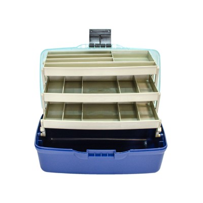 Трёхполочный ящик для рыболовных снастей. Изготовлен из полипропилена, устойчив к воздействию масел, растворителей и силиконов. Блок из трёх полочек имеет раскладную конструкцию. В транспортном положении полочки плотно прилегают друг к другу, не давая содержимому рассыпаться. Система фиксированных и съёмных перегородок позволяет формировать внутренние пространство по своему усмотрению. Основное отделение ящика не имеет перегородок и предназначено для хранения крупных предметов. Оснащен прозрачной крышкой, которая крепиться с помощью шарнирного соединения, закрывается на замок-защелку. Подходит для транспортировки и хранения любых приманок.