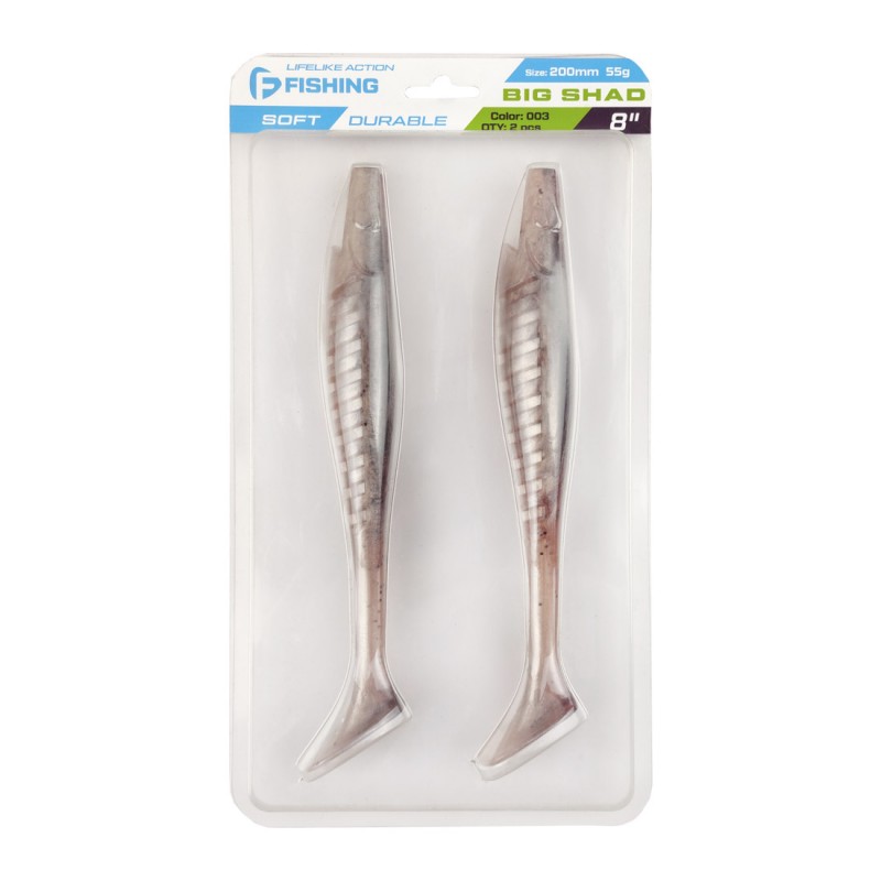 F-FISHING Big Shad 8" – крупный виброхвост удлиненной формы, изготовленный из мягкого силикона. Тело приманки сплющено с боков, сверху и снизу имеются специальные прорези, оптимизирующие использование Big Shad с офсетным крючком. Благодаря объемной пятке виброхвост начинает играть даже при самой медленной проводке. Игра его легкая и размашистая. Колебания хвоста передаются на тело, благодаря чему приманка раскачивается при проводке, привлекая хищника с больших расстояний. На теле Big Shad имеются специальные насечки, которые создают привлекательную для хищника турбулентность. Приманка отлично работает на классической джиг-головке, шарнирном монтаже, штопоре. Модель прекрасно подойдет для ловли трофейного судака, щуки и сома. Большой рыбе – крупная приманка, – это как раз о Big Shad!