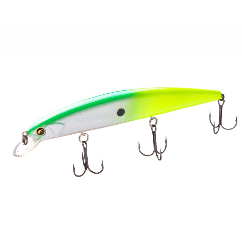F-Fishing Hellcat 130F – крупный, сильно вытянутый воблер, который прекрасно работает при поиске щуки на больших акваториях. Имеет длину 130 мм и весит 19 г. Система дальнего заброса обеспечивает очень сильное смещение центра тяжести в хвостовую часть, благодаря чему воблер летит как дротик – далеко, точно и с минимальными колебаниями. В передней части корпуса шарики фиксируются приливом на дне канала, по которому они передвигаются. Благодаря этому воблер при проводке имеет фиксированный центр тяжести. Уходы в стороны во время рывковой проводки Hellcat 130 совершает очень дальние, как и положено воблеру такой большой длины с вытянутыми пропорциями. Характерной особенностью движений воблера является покачивание с боку на бок во время этих уходов. Оно не затухает даже после полной остановки приманки и является дополнительным привлекающим фактором, провоцирующим хищника на атаку во время паузы. При равномерной проводке Hellcat 130 F обладает не слишком интенсивной высокочастотной игрой, поэтому лучше не использовать эту приманку для равномерной проводки в стоячих водоемах. Впрочем, при проводке потяжками, как ведут крэнкбейты, воблер демонстрирует хорошие результаты. Оснащен тремя острейшими крючками VMC и усиленными заводными кольцами.