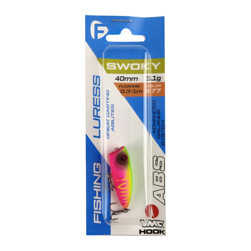 Приманка обладает отличными полетными качествами, отменно играет, издает четкие булькающие звуки. Вдобавок, часть моделей Swoky 40 F покрыты уникальной краской, которая светится в ультрафиолете, прекрасно привлекая своих «жертв» в пасмурную погоду и при недостаточной освещенности. F-FISHING Swoky 40F комплектуется чрезвычайно острыми и легкими тройниками VMC, которые великолепно удерживают рыбу. Этот шумный и уловистый малыш, несомненно, придется по вкусу как рыбе, так и любителям ультралайтовой ловли.
