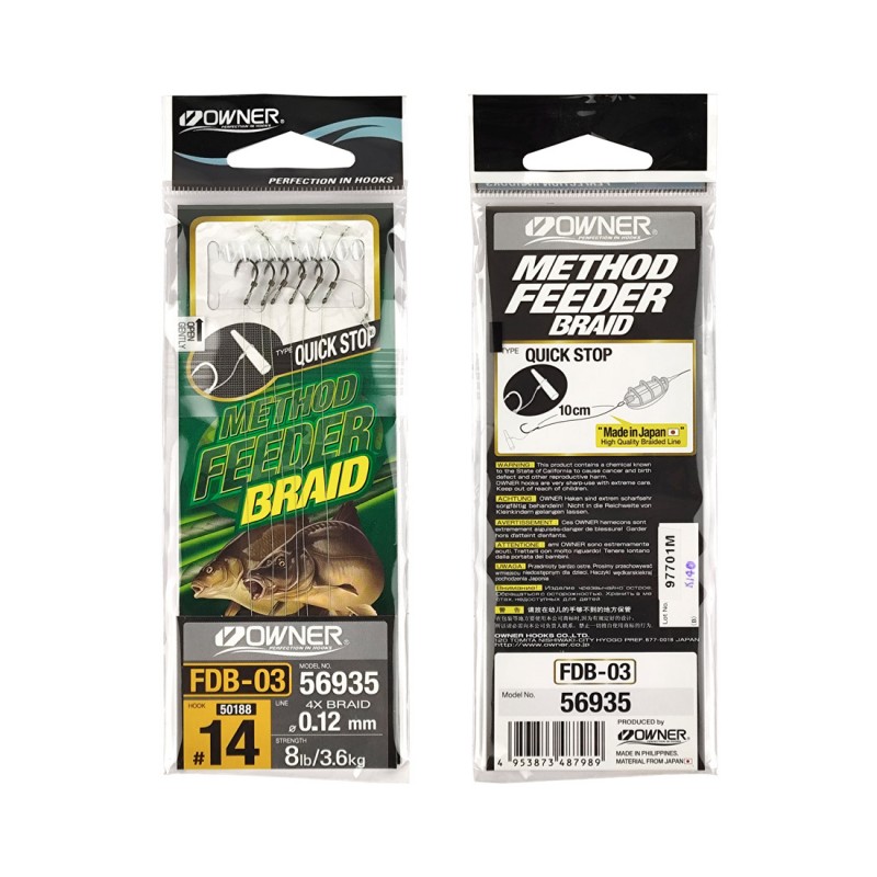 Крючки Owner Method Feeder Quick Stop FDВ-03, для карпфишинга и другой мирной рыбы, с готовым поводком, для облегчения монтажа при фидерной ловле на берегу водоемов и экономии времени. Эти крючки с поводком предназначены для монтажа по типу Feeder Method в Карпфишинге, с готовой фиксацией для удерживания наживки на волосе монтажа возле крючка. Что облегчает и экономит время при наживлении насадки на монтаж.В данной системе волоса представлена фиксация стопора Quick Stop с силиконовым фиксатором. Которая максимально позволяет не повредить мягкую и нежную наживку как растительного так и животного происхождения, но при этом хорошо удерживает ее на волосе. Этот монтаж возможно наживлять и бойлами, пеллетсом не большого розмера мягкой структуры. Длина поводков составляет 10 см, а диаметр лески с разрывной нагрузкой подобран под размеры крючков в соответствии с предполагаемыми нагрузками и размерами рыбы и ловли под тип монтажа Feeder Method.